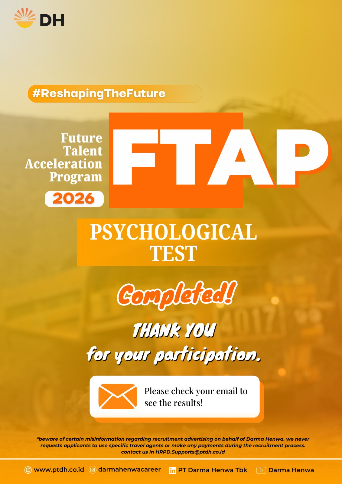 Kindly confirm to our official number (+62 21 2991 2350) and email (Recruitment@ptdh.co.id) regarding any payment or purchase request made by individuals in the recruitment process.